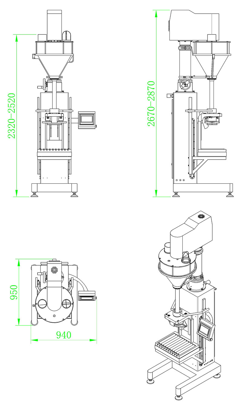 伺服馬達(dá)帶動托盤升降,升降速度可任意設(shè)定,充填時基本上無粉塵揚(yáng)出污染環(huán)境。